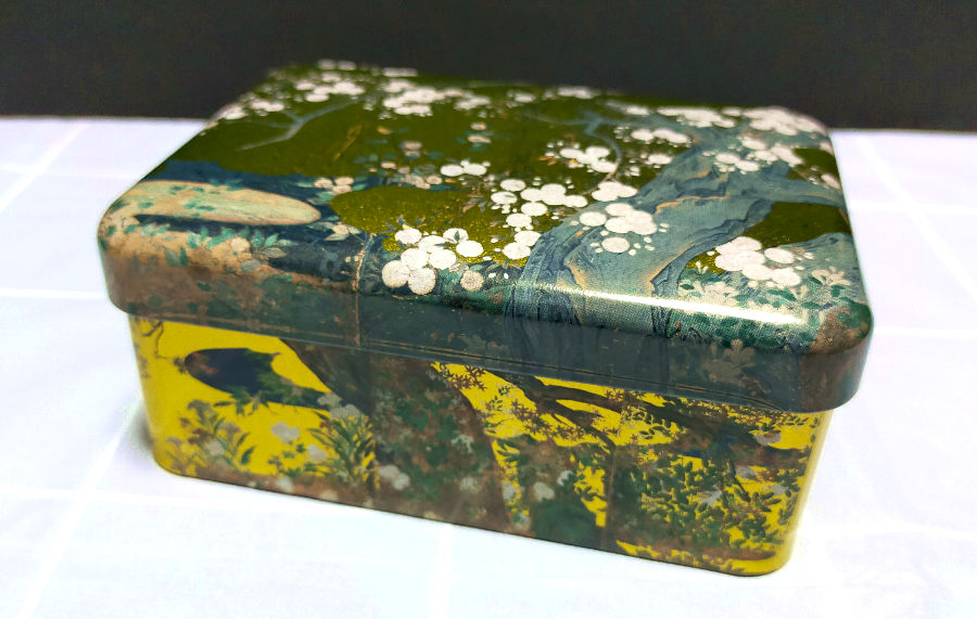 国宝の「桜図」と「楓図」があしらわれた方形の缶。