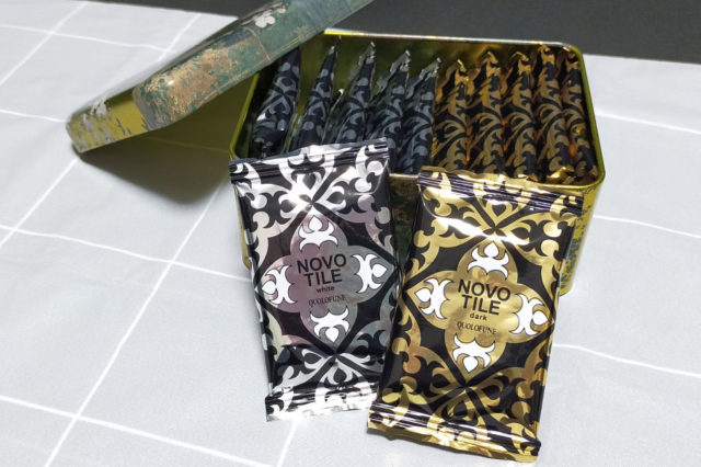 実際の店舗で販売されているノボタイルは、個包装の袋と同様のデザインで白黒でダマスクやアールデコを思わせる柄になっています。